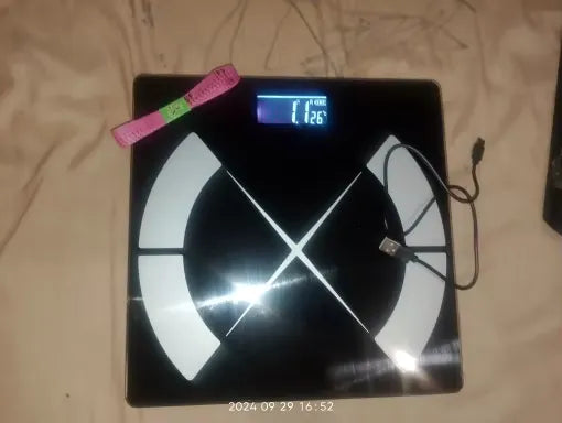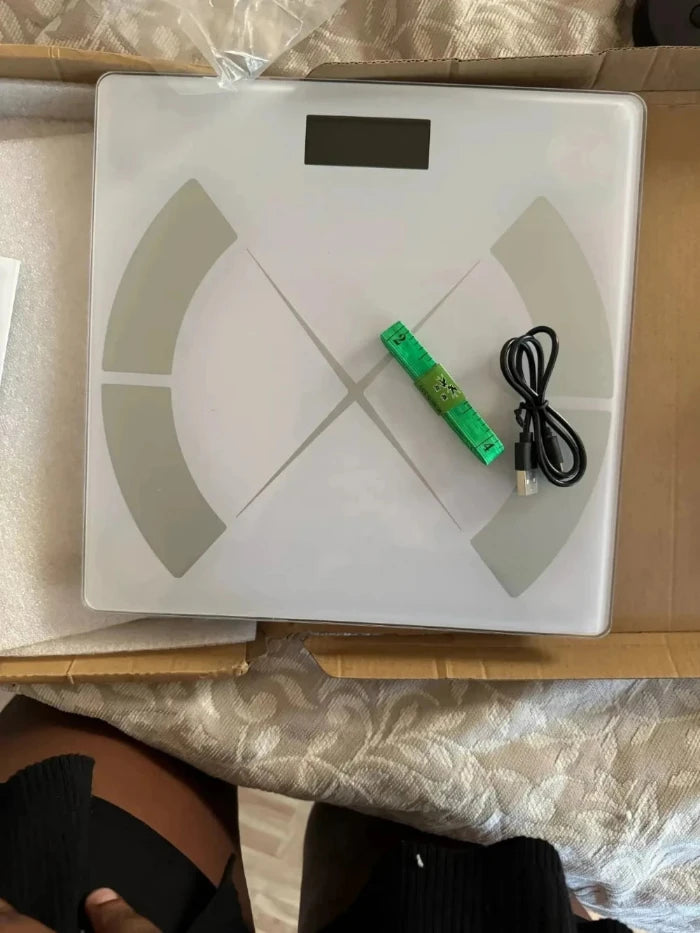 Boostez votre routine bien-être avec notre balance intelligente de composition corporelle de pointe. Elle ne mesure pas seulement le poids mais vous donne un aperçu de la graisse, de l'eau, des os, des muscles, et plus encore. Tout est affiché sur un écran LCD clair qui ajuste automatiquement la luminosité. Restez connecté grâce à son intégration fluide avec l'application Bluetooth, vous permettant de fixer des objectifs, suivre vos progrès et personnaliser votre parcours santé avec facilité. Le design assure la stabilité, avec des patins antidérapants et un chargement USB, s'intégrant parfaitement à votre style de vie.
